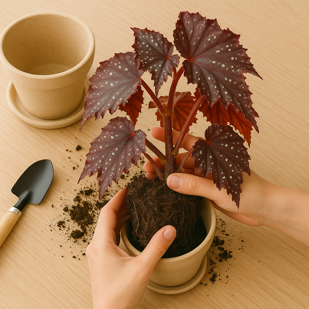 Outro ponto essencial: não fertilize a begônia imediatamente após o replantio. Espere cerca de 2 a 3 semanas para não sobrecarregar as raízes que ainda estão se adaptando.