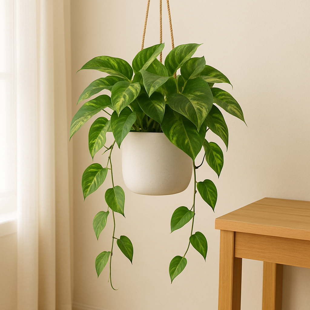 A jiboia se desenvolve muito bem como planta pendente. Vasos suspensos permitem que seus ramos caiam livremente, criando um visual natural e fluido. Ideal para varandas, prateleiras altas ou canto da sala com luz difusa.
