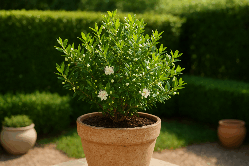 • Myrtus communis: Folhagem densa e flores perfumadas, ideal para cercas vivas.