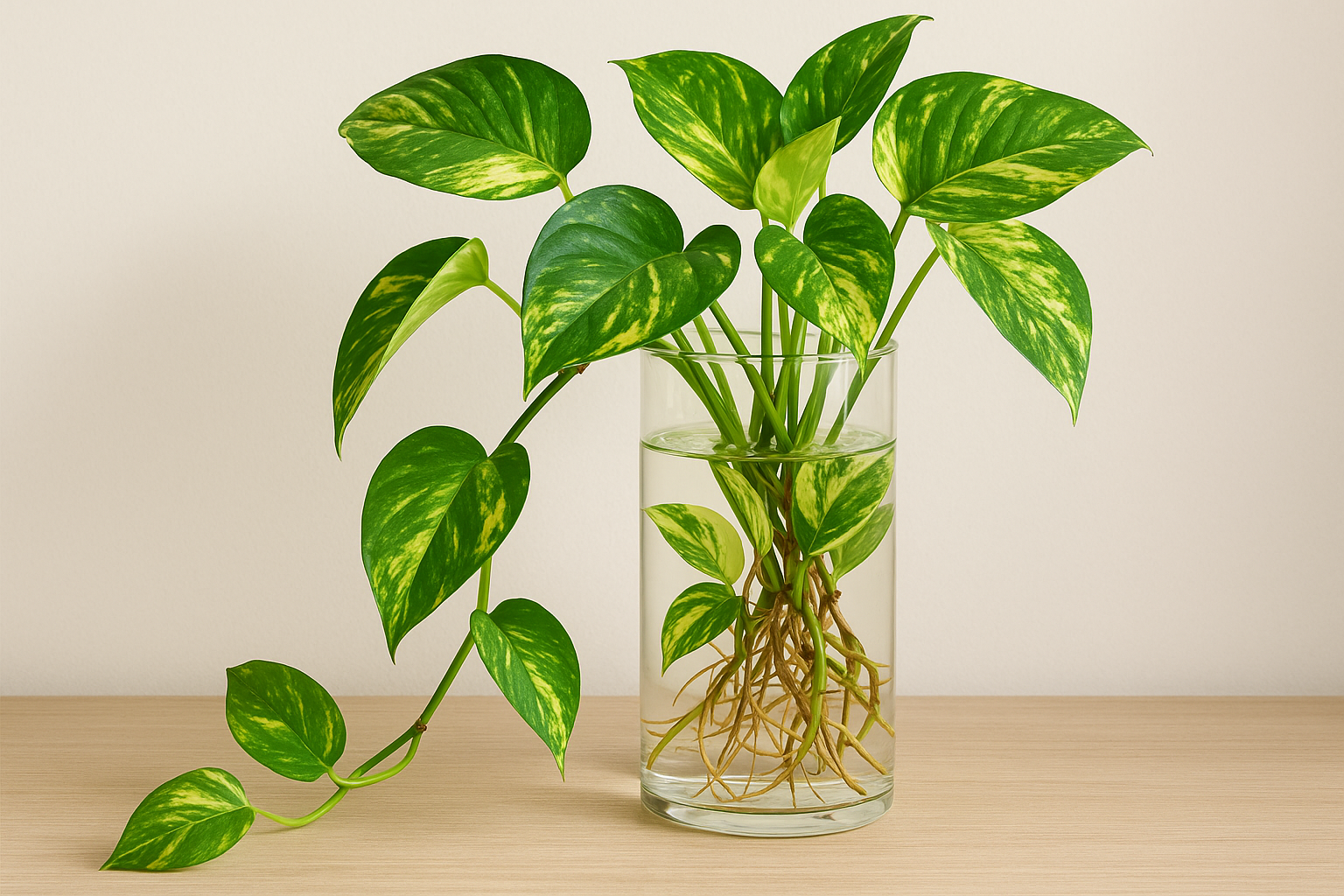 Basta cortar uma muda com raiz e colocá-la em um copo ou pote com água limpa. Ele se adapta bem a recipientes pequenos e é perfeito para bancadas, janelas ou banheiros bem iluminados.