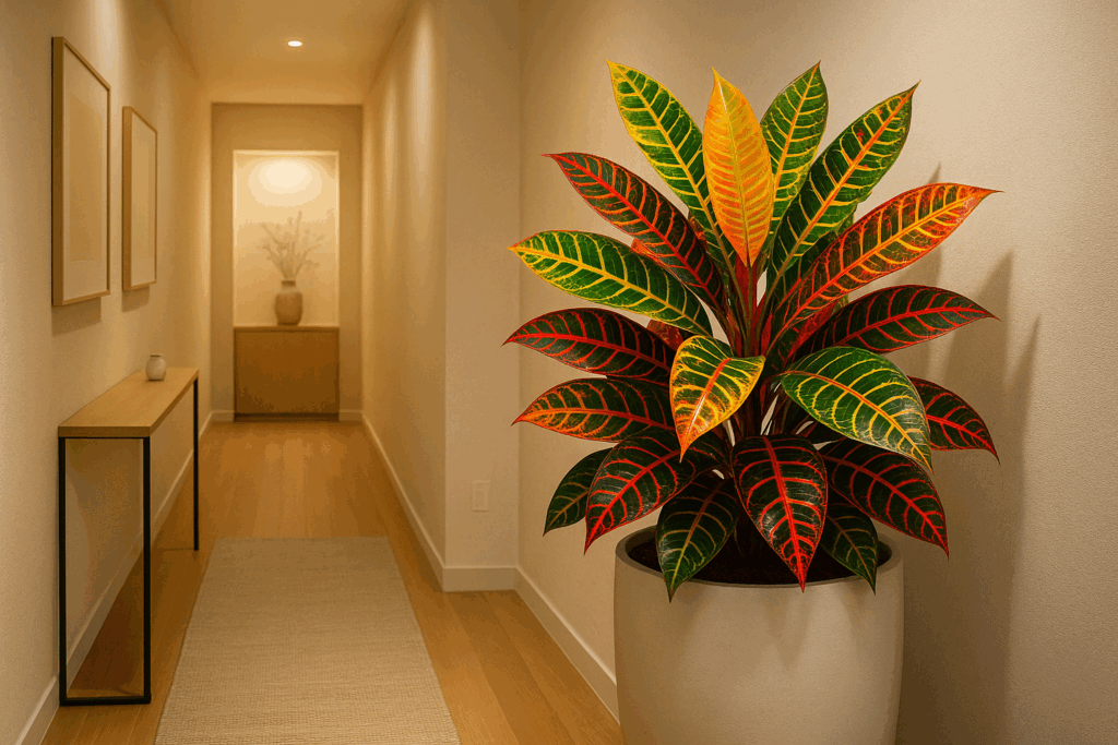 Conhecida também como cróton brasileirinha, essa planta é um verdadeiro show de cores: verde, amarelo, vermelho tudo isso numa única folha! E o melhor? Ela se adapta super bem a ambientes internos com luz indireta, como a maioria dos corredores residenciais.